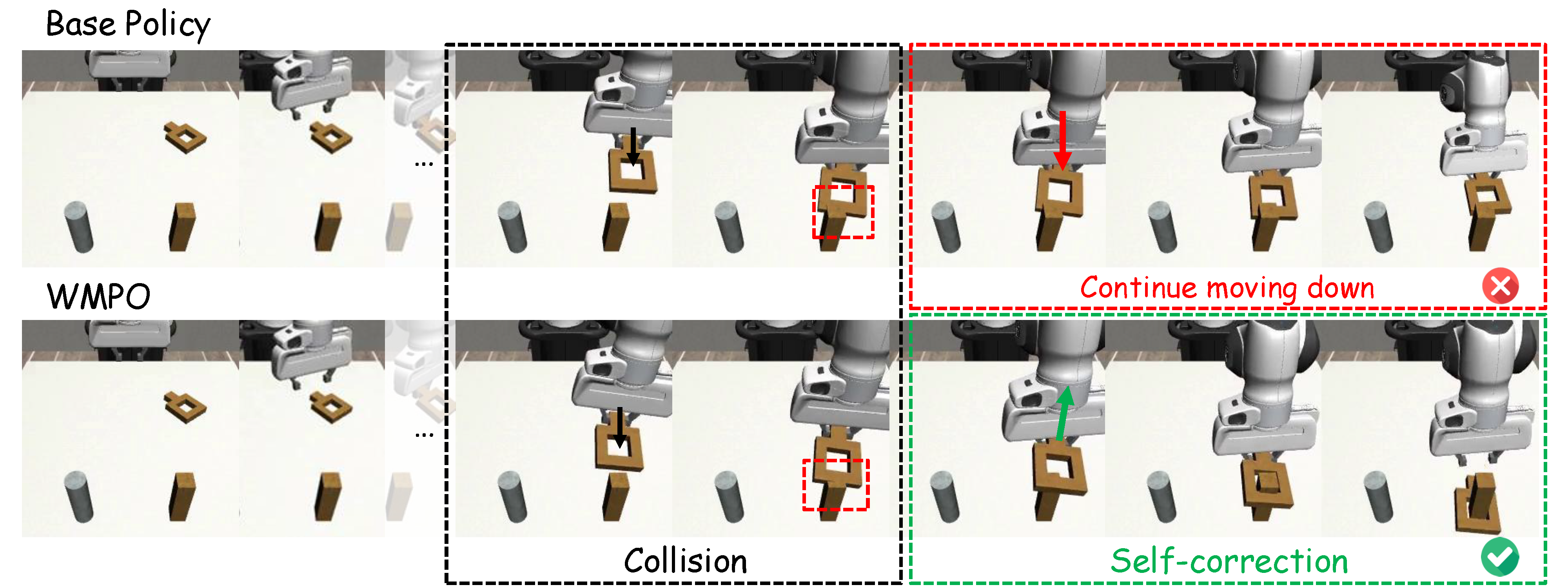 Figure 3. Behavior analysis of the Square task (inserting the square into the stick) shows that, compared with the base policy, WMPO demonstrates the ability to self-correct.