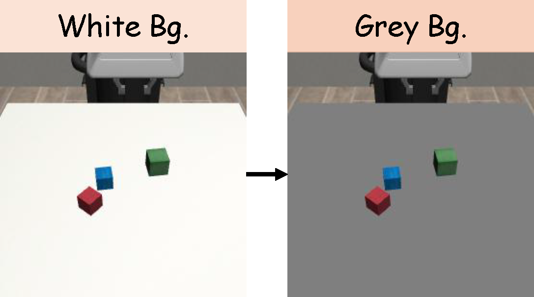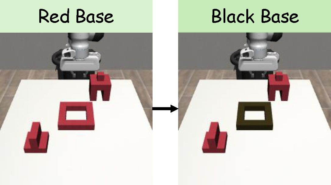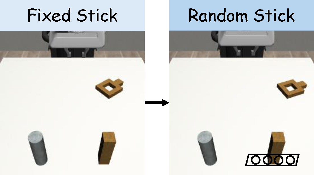 Figure 4. (a) For the Square task, we vary the stick’s position from fixed to a random position inside a rectangle. (b) For the StackThree task, we substitute the tabletop background with a gray background. (c) For the ThreePieceAssembly task, we substitute the red base with a dark wooden base.