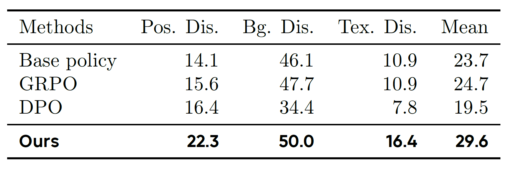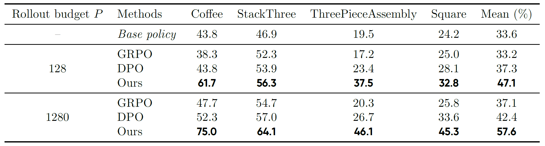Table 1. Comparison of policy optimization methods across four manipulation tasks in the Mimicgen simulation benchmark. Results show that WMPO consistently outperforms both GRPO and DPO baselines under different budgets. As the rollout budget increases from \(128\) to \(1280\), WMPO continues to exhibit substantial improvements, highlighting both its data efficiency and scalability.