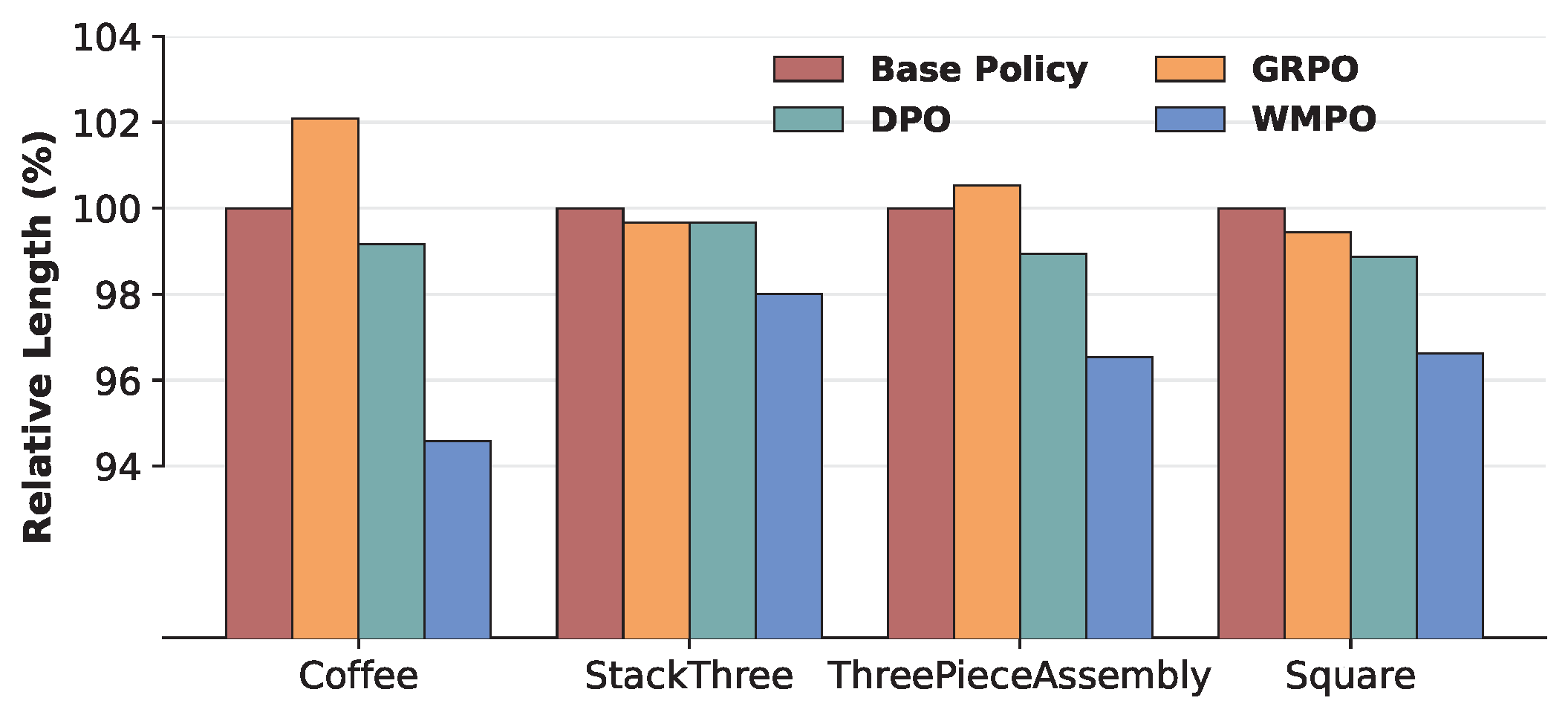 Figure 5. Relative average trajectory length of successful trials across different policies (Base Policy = \(100\%\)).