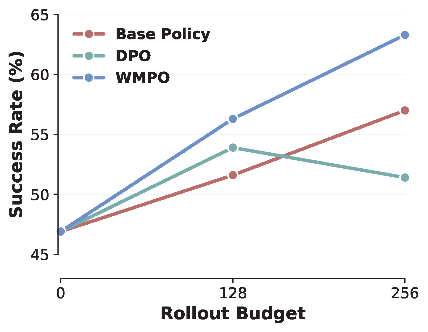 We compare WMPO with two established RL algorithms, GRPO and DPO, both widely used for optimizing large language models. To ensure fairness, all methods are allocated the same real rollout budget \(P\) (i.e., the number of full real trajectories available for policy optimization). We consider both online and offline baselines: GRPO is implemented in an online setting, where the policy is updated directly from trajectories collected in the environment; DPO is implemented in an offline setting, where the base policy serves as the reference and trajectory pairs (success vs. failure) are constructed for optimization using the standard DPO loss. Unlike GRPO, which discards trajectories after each update, DPO can repeatedly reuse collected data, but it lacks the ability to update the policy online as WMPO does. Performance is reported as the task success rate (%).